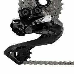 The Shimano Dura-Ace Di2 12-speed rear derailleur is the centerpiece of Shimano’s top-of-the-line Dura-Ace Di2 road bike group, offering semi-wireless and fully wired shifting. Constructed primarily of aluminum and carbon, it is approximately 50 grams lighter than the Ultegra model. The RD-R9250, in its disc brake version, communicates wirelessly with the shift/brake lever via a built-in radio chip, offering more functionality than a traditional rear derailleur. Rim brake versions with cable connection to STI are responsible for coupling the components.