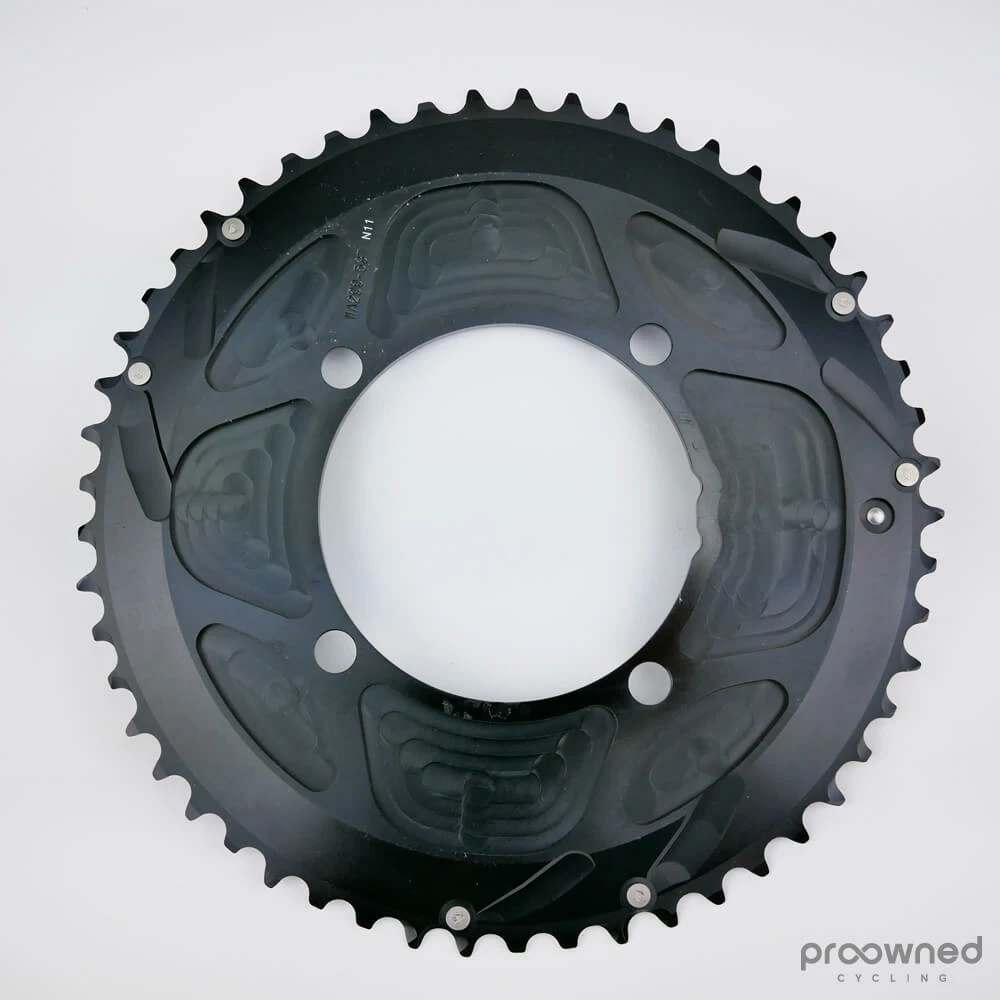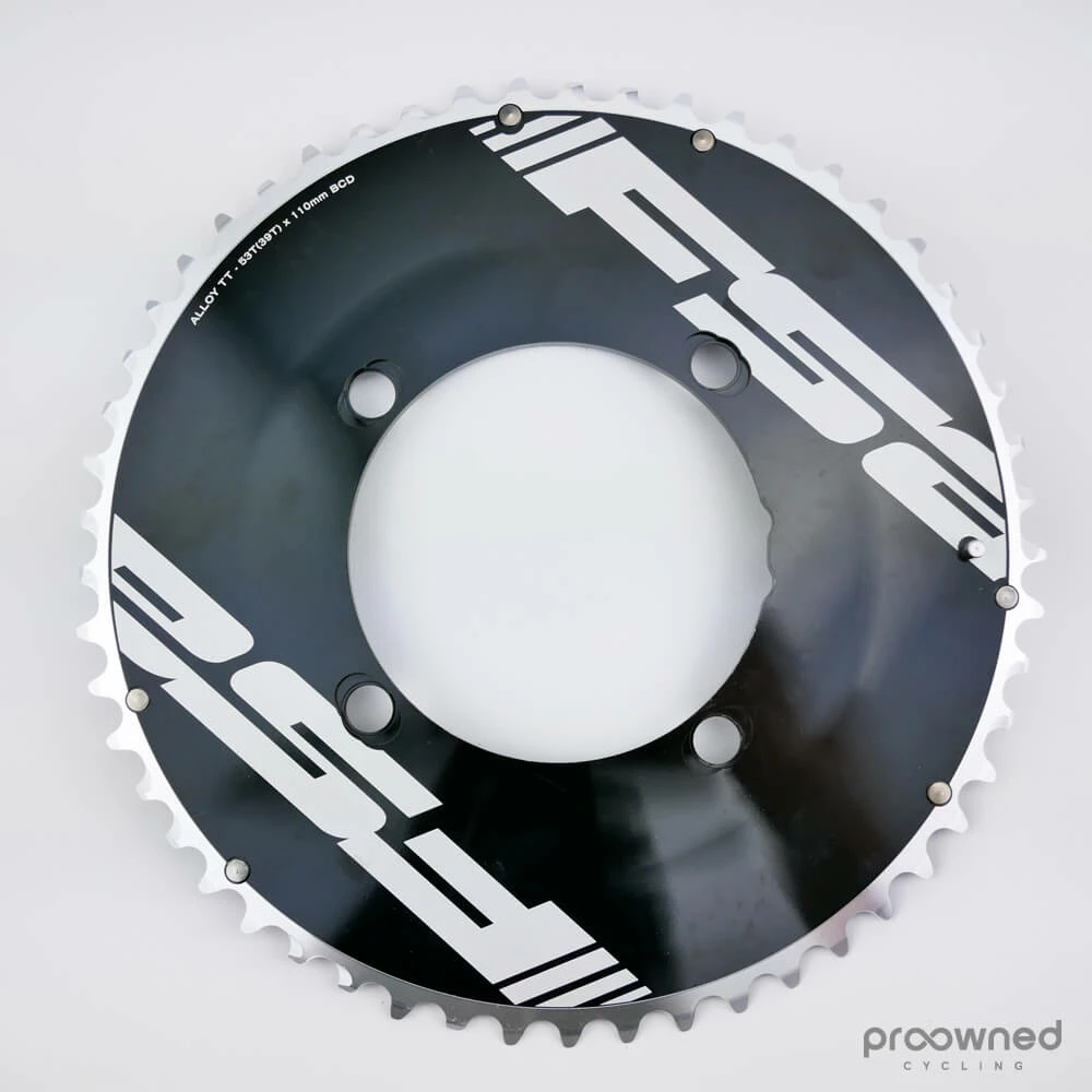 Brand new FSA Aero Chainring for 11-speed groupsets. This chainring fits cranksets with four bolts and 110 bcd. With 53 teeth it fits perfectly in combination with a 39T inner chainring. The aerodynamic design makes it perfect for TT’s or any rider who is focused on reducing aerodynamic drag.